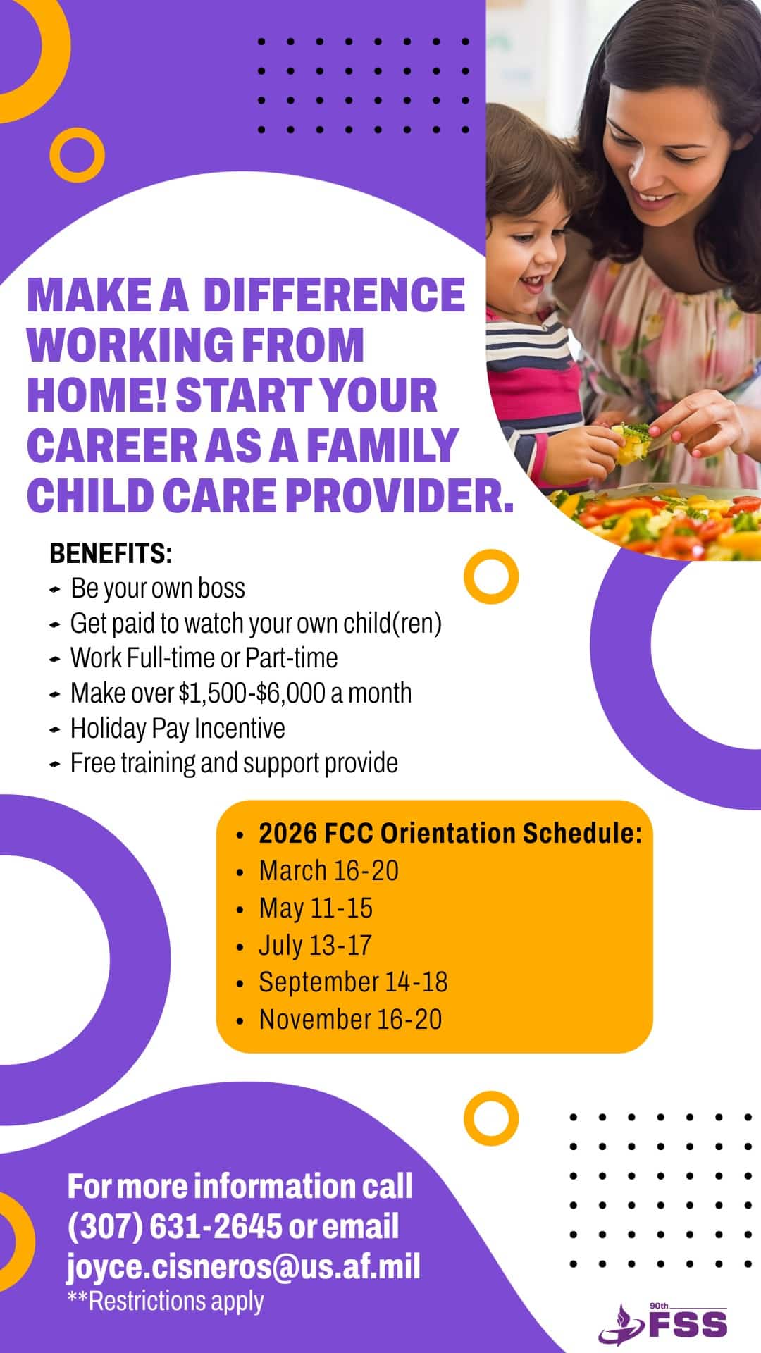 March 16 - 20, 8:30 a.m. - 3:30 p.m. FCC New Provider Course The FCC New Provider Course equips participants with the tools and guidance required to become a provisionally certified FCC Provider. Additional course dates are available at funatwarren.com. Register by calling (307) 631-2645 or emailing joyce.cisneros@us.af.mil for details. |